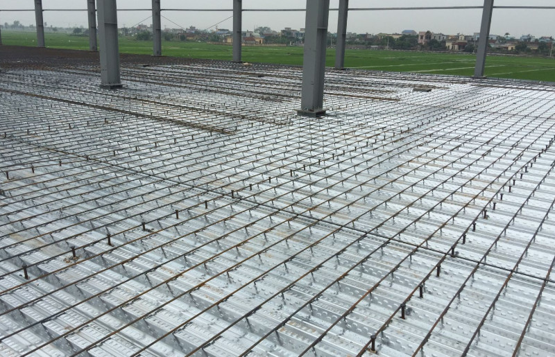 Sàn nền sử dụng hệ kết cấu liên hợp - sàn Deck . Bao gồm tấm tôn Deck được dập sóng. Sau khi lắp đặt tấm Deck lên khung kết cấu, tiến hành dải thép sàn xây dựng D10 , kết hợp đinh hàn chống cắt, sau đó đổ bê tông . Lưu ý mác bê tông tối thiểu M300 theo tiêu chuẩn.